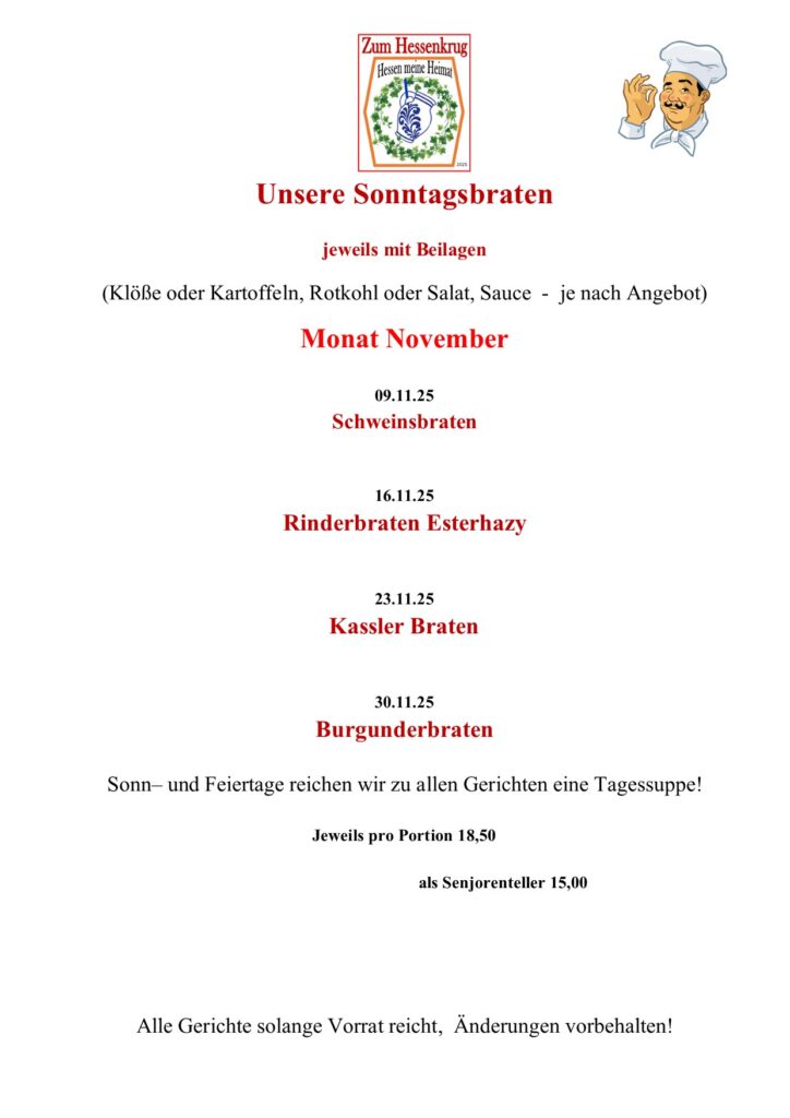 An Sonn- und Feiertagen bieten wir von 11:30 Uhr bis 16:00 immer eine wöchentlich wechselnde Sonntagskarte