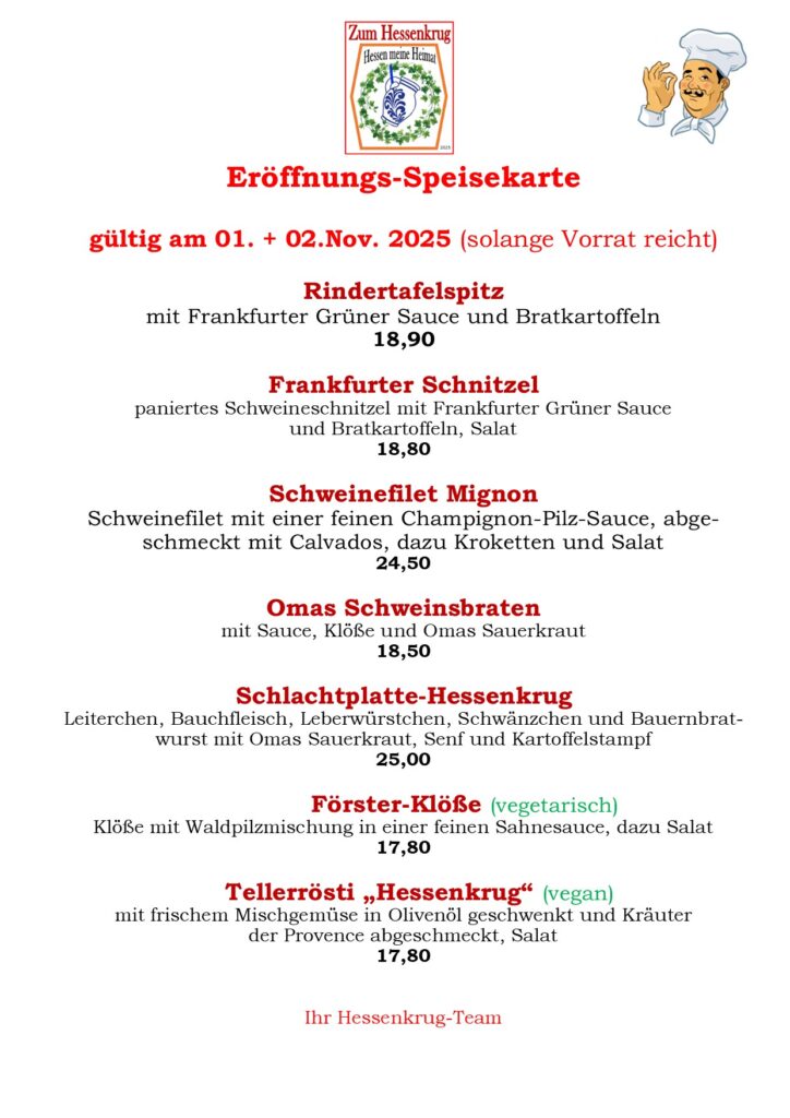 Eröffnungskarte Eröffnungs-Speisekarte gültig am 01. + 02.Nov. 2025 (solange Vorrat reicht) Ihr Hessenkrug-Team